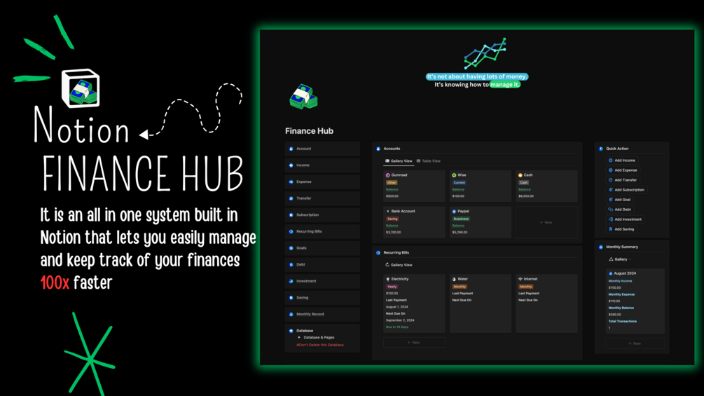 Finance Hub is an all in one system built in Notion that lets you easily manage and keep track of your finances.
